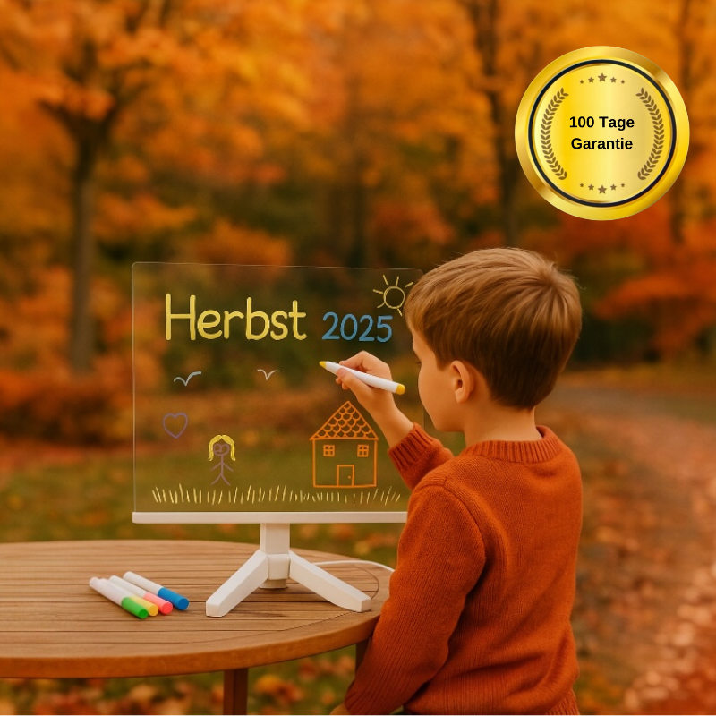Dein Kind schreibt oder zeichnet seine Ideen spielend leuchtend auf die Tafel. Der praktische Ständer macht das Aufstellen kinderleicht. Und das Beste: Mit einem Tuch ist alles im Handumdrehen wieder sauber – für endlose, wiederverwendbare Kreativität, ganz ohne Papierchaos!